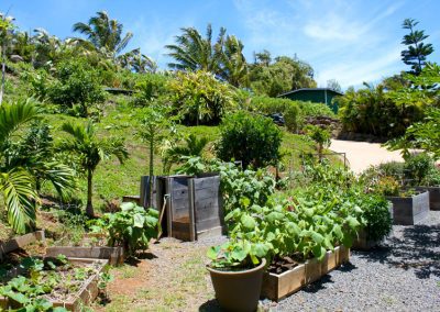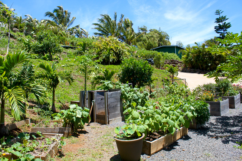 Ten raised garden beds and an orchid nursery allow for year-round cultivation of food and flowers.